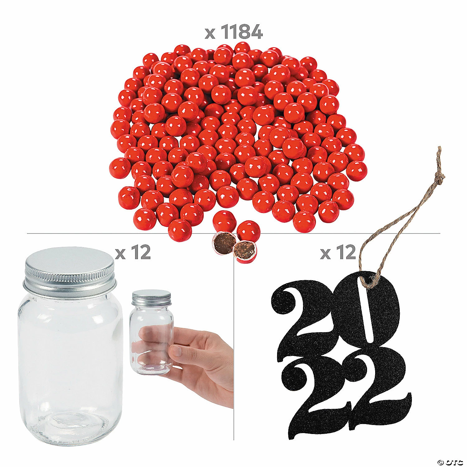 Use this graduation party favor kit to put together the perfect favors for friends and family! Featuring a glass jar with colorful candy and a 2022 tag, these small gifts will delight your guests. With several colors available, choose the candy color that will complement your graduation party decorations the best. (1208 pcs./unit) Simple assembly required.Includes:• 12 Glass with Metal Lid Mini Mason Favor Jars (3 1/4”)• 1184-pc. Sixlets® Chocolate Candy (Total wt., 2 lbs. Candy is non-returnable. For more information, visit our “Return Policy” page located on our website. Ingredient, nutrition, allergen and other product information are provided on our Web and Mobile sites for reference purpose only, without warranty or representation as to accuracy. Manufacturers adjust their labeling regularly and are solely responsible for the accuracy of the information. For general questions concerning these items, please contact our customer service at 800-228-0475.• 12 Cardstock Stacked 2022 Year Favor Tags (2 1/4” x 3”)• Assortments are subject to change at any time and may vary from picture shown. Substituted items will be similar in nature.
