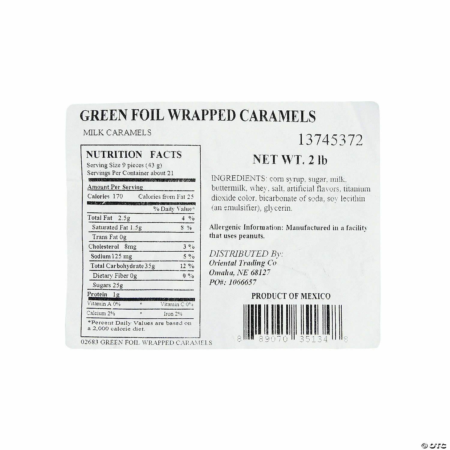 Are you looking for a sweet addition to your party supplies? Unwrap true happiness with these Foil-Wrapped Caramels. Perfect for any and every special celebration, these caramel treats will look absolutely fabulous in a candy buffet. Perfect for wedding receptions, birthday parties, holiday celebrations and so many more big occasions! Individually wrapped. (Approx. 189 pcs. per unit) Total wt., 2 lbs.• Candy is non-returnable. For more information, visit our “Return Policy” page located on our website.• Ingredient, nutrition, allergen and other product information are provided on our Web and Mobile sites for reference purpose only, without warranty or representation as to accuracy. Manufacturers adjust their labeling regularly and are solely responsible for the accuracy of the information. For general questions concerning these items, please contact our customer service at 800-228-0475.