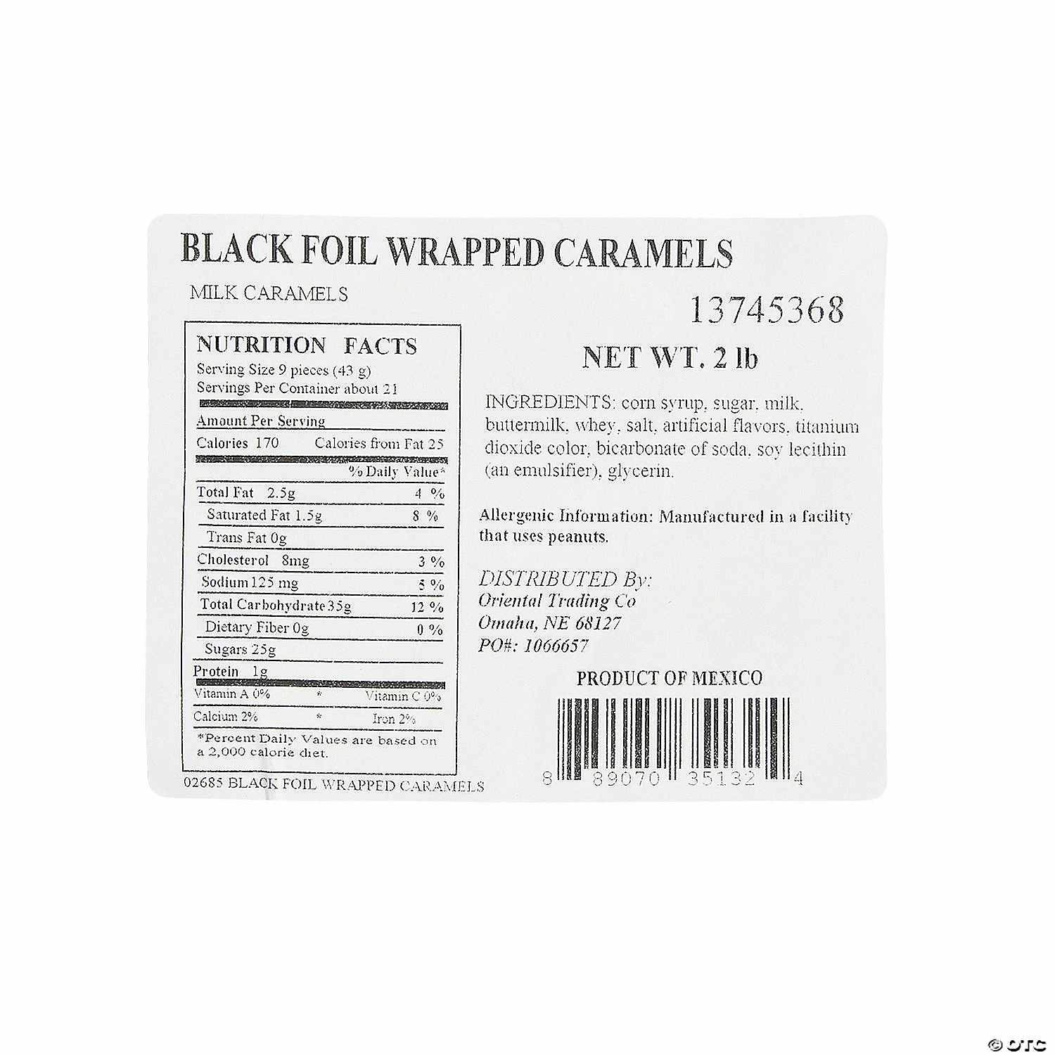 Are you looking for a sweet addition to your party supplies? Unwrap true happiness with these Foil-Wrapped Caramels. Perfect for any and every special celebration, these caramel treats will look absolutely fabulous in a candy buffet. Perfect for wedding receptions, birthday parties, holiday celebrations and so many more big occasions! Individually wrapped. (Approx. 189 pcs. per unit) Total wt., 2 lbs.• Candy is non-returnable. For more information, visit our “Return Policy” page located on our website.• Ingredient, nutrition, allergen and other product information are provided on our Web and Mobile sites for reference purpose only, without warranty or representation as to accuracy. Manufacturers adjust their labeling regularly and are solely responsible for the accuracy of the information. For general questions concerning these items, please contact our customer service at 800-228-0475.