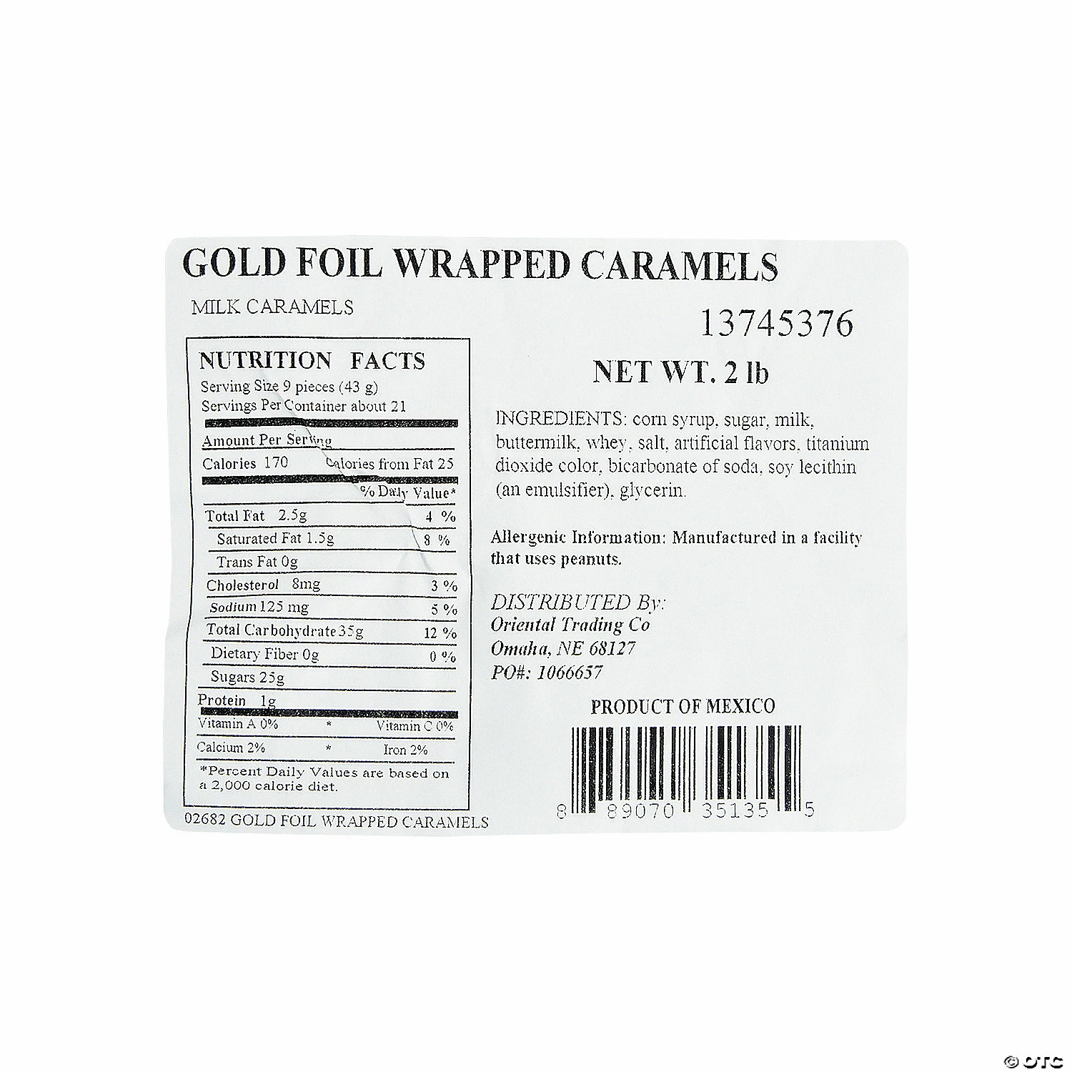 Are you looking for a sweet addition to your party supplies? Unwrap true happiness with these Foil-Wrapped Caramels. Perfect for any and every special celebration, these caramel treats will look absolutely fabulous in a candy buffet. Perfect for wedding receptions, birthday parties, holiday celebrations and so many more big occasions! Individually wrapped. (Approx. 189 pcs. per unit) Total wt., 2 lbs.โข Candy is non-returnable. For more information, visit our โReturn Policyโ page located on our website.โข Ingredient, nutrition, allergen and other product information are provided on our Web and Mobile sites for reference purpose only, without warranty or representation as to accuracy. Manufacturers adjust their labeling regularly and are solely responsible for the accuracy of the information. For general questions concerning these items, please contact our customer service at 800-228-0475.