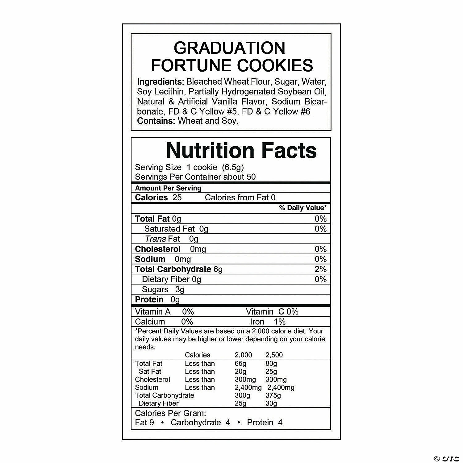 Let these individually wrapped cookies wish you sweet success! Create unique party favors by tossing some of these graduation fortune cookies into a “take-out” box with some other Asian-inspired goodies. (50 pcs. per unit) © OTC• Dairy-free. • Kosher (Pareve). • Made in the USA, Important Country of Origin Information: For certain items sold by OTC on our Web or Mobile sites, country of origin information can change and what is displayed may not be accurate or consistent with manufacturer information. For up to date country of origin information, it is recommended that you rely on product packaging or other manufacturer information.• Nut-free. • Edibles are non-returnable. For more information, visit our “Return Policy” page located on our website.• Ingredient, nutrition, allergen and other product information are provided on our Web and Mobile sites for reference purpose only, without warranty or representation as to accuracy. Manufacturers adjust their labeling regularly and are solely responsible for the accuracy of the information. For general questions concerning these items, please contact our customer service at 800-228-0475.