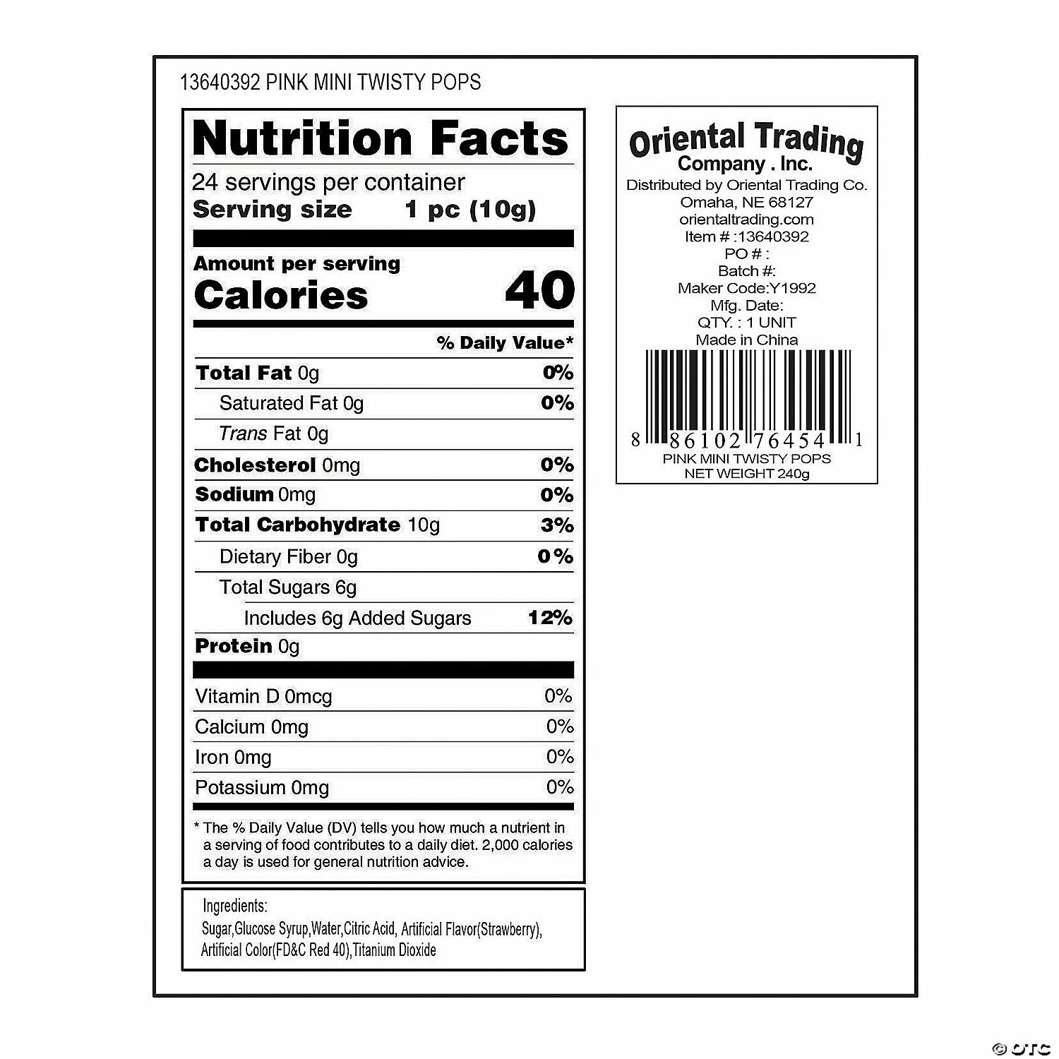 These Mini Twisty Pops make a fun and fashionable addition to your candy buffet! This popular candy can also be used to make wedding reception centerpieces and makes a great addition to party favor bags. Comes in a variety of colors and flavors to sweeten up any soirรฉe! Each 2″ strawberry-flavored sucker is on a 4″ plastic stick. Individually wrapped. (24 pcs. per unit) Fat-free. Total wt., 9 oz. Candy is non-returnable. For more information, visit our โReturn Policyโ page located on our website.