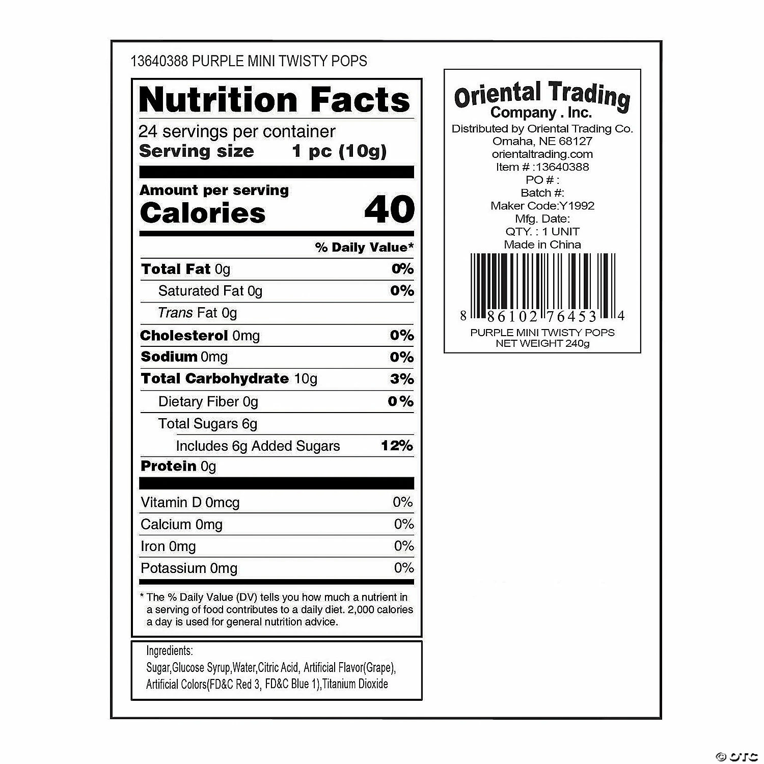 These Mini Twisty Pops make a fun and fashionable addition to your candy buffet! This popular candy can also be used to make wedding reception centerpieces and makes a great addition to party favor bags. Comes in a variety of colors and flavors to sweeten up any soirรฉe! Each 2″ grape-flavored sucker is on a 4″ plastic stick. Individually wrapped. (24 pcs. per unit) Fat-free. Total wt., 9 oz. Candy is non-returnable. For more information, visit our โReturn Policyโ page located on our website.
