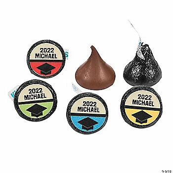 Make every Kiss special! This colorful assortment of personalized chocolate stickers can help you create tasty graduation party favors that will make your celebration memorable. Add the personalized Hershey’s® Kisses® to your candy buffet or make your treat bags even more luscious! Make your star student feel extra special with drops of sweetness just for them! Take a look around our website for even more unique graduation party supplies and graduation party decorations. Assortment may vary. Color choice is not available. Personalize with 2 lines of text. Vinyl. (60 pcs. per unit) 3/4″ diam. Candy sold separately online. © OTC
