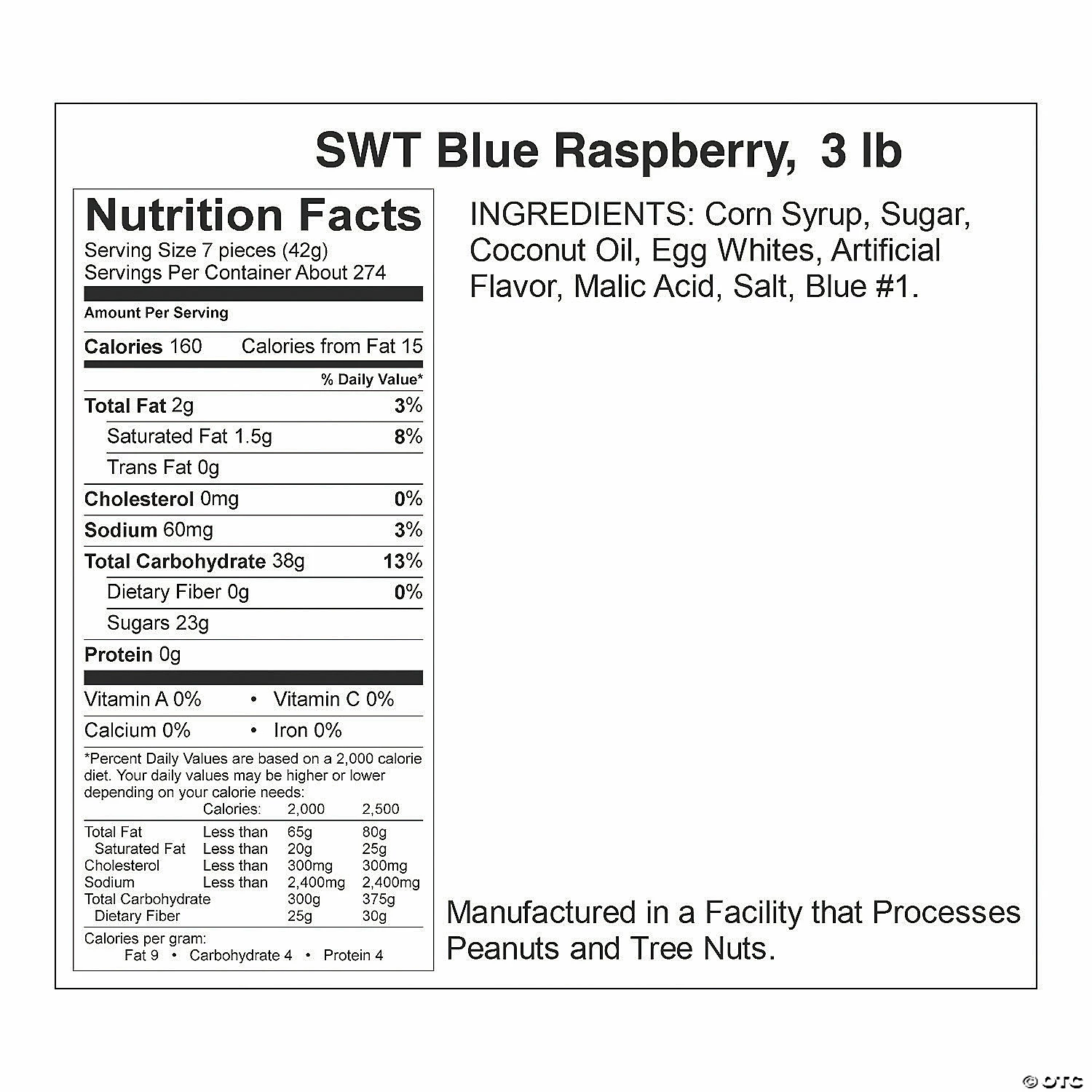 A sweet, chewy treat for any occasion! Add these mouth-watering fruit flavors to candy buffets at wedding receptions, toss into birthday party gift bags, stock up for Halloween trick-or-treaters or give away to party guests at holiday parties. Our bulk price lets you sink your teeth, not your wallet, into big batches of Salt Water Taffy to share with party guests, friends and family or just enjoy for yourself. Individually wrapped. Blue raspberry flavor. (Approx. 193 pcs. per unit) Total wt., 3 lbs.โข Fat-free. โข Gluten-free.โข Candy is non-returnable. For more information, visit our โReturn Policyโ page located on our website.โข Ingredient, nutrition, allergen and other product information are provided on our Web and Mobile sites for reference purpose only, without warranty or representation as to accuracy. Manufacturers adjust their labeling regularly and are solely responsible for the accuracy of the information. For general questions concerning these items, please contact our customer service at 800-228-0475.