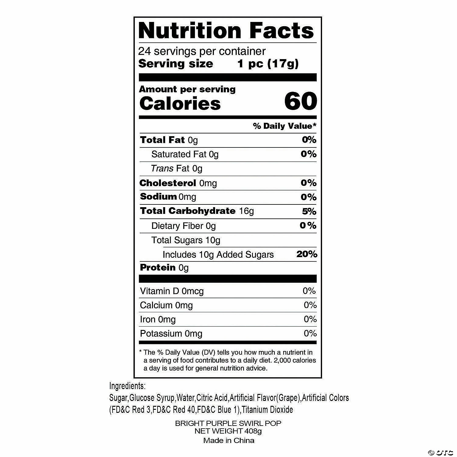 These suckers are a great treat to have around during wedding receptions, birthday parties, carnivals, fundraisers or wherever you need to brighten up your treat table or candy buffet! Sweet, tasty fun for both kids and adults! Grape flavor. Individually wrapped. Each 2″ pop is on a 4 1/2″ plastic stick. (2 dozen per unit) Total wt., 14 oz. Fat-free. Gluten-free. © OTC• Candy is non-returnable. For more information, visit our “Return Policy” page located on our website.• Ingredient, nutrition, allergen and other product information are provided on our Web and Mobile sites for reference purpose only, without warranty or representation as to accuracy. Manufacturers adjust their labeling regularly and are solely responsible for the accuracy of the information. For general questions concerning these items, please contact our customer service at 800-228-0475.